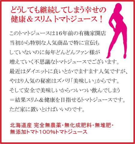 ) ○品名:トマトジュース ○原材料名:北海道江本自然農園産 無農薬・無化成肥料・無施肥栽培 トマト・ミニトマト果汁100% ○未開封での賞味期限は常温保存で約1年です。