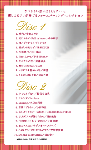 製品仕様商品名リラクシング・ピアノ〜ベスト フォーエバー・ソングス収録楽曲Disc11. 時代(中島みゆき)2. 恋におちて - Fall in love -(小林明子)3. M(プリンセス プリンセス)4. 君がいるだけで(米米CLUB)5. 少年時代(井上陽水)6. First Love(宇多田ヒカル)7. サボテンの花(財津和夫)8. 夏の日の1993(class)9. オリビアを聴きながら(杏里)10. さよならの向う側(山口百恵)Disc21. 守ってあげたい(松任谷由実)2. フレンズ(レベッカ)3. Missing(久保田利伸)4. 言葉にできない(小田和正)5. うれしい!たのしい!大好き!(DREAMS COME TRUE)6. もしもピアノが弾けたなら(西田敏行)7. PIECE OF MY WISH(今井美樹)8. TSUNAMI(サザンオールスターズ)9. CAN YOU CELEBRATE?(安室奈美恵)10. SWEET MEMORIES(松田聖子)素材/材質-色ジャケットごとに異なるご注意事項モニターの発色の具合によって実際のものと色が異なる場合がございます。
